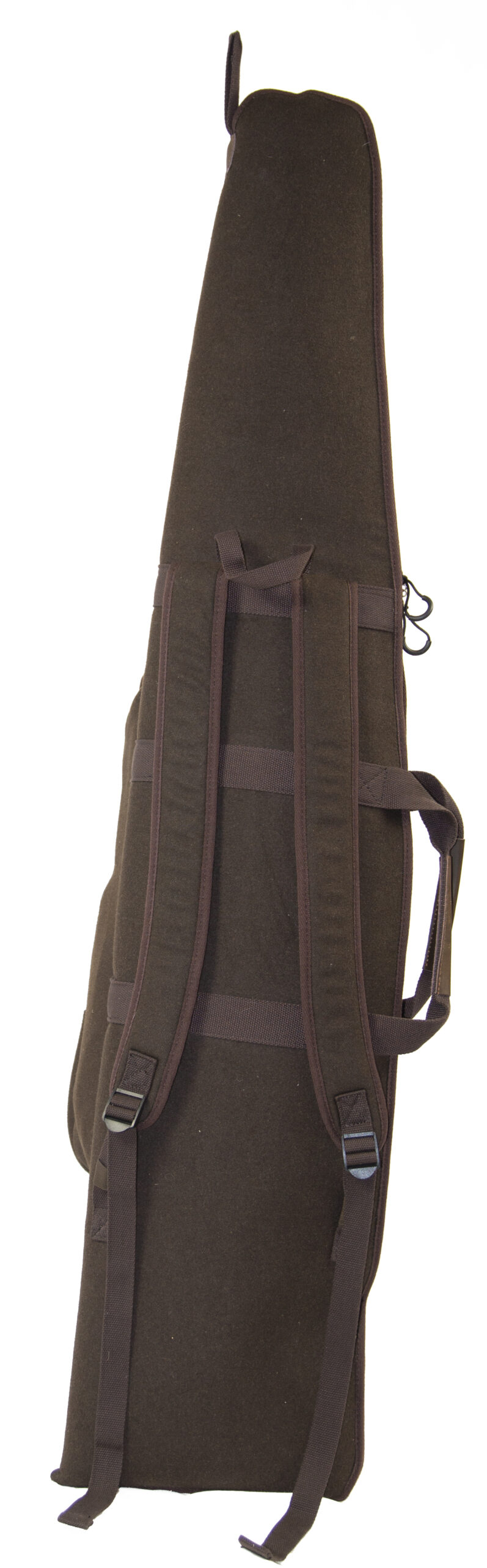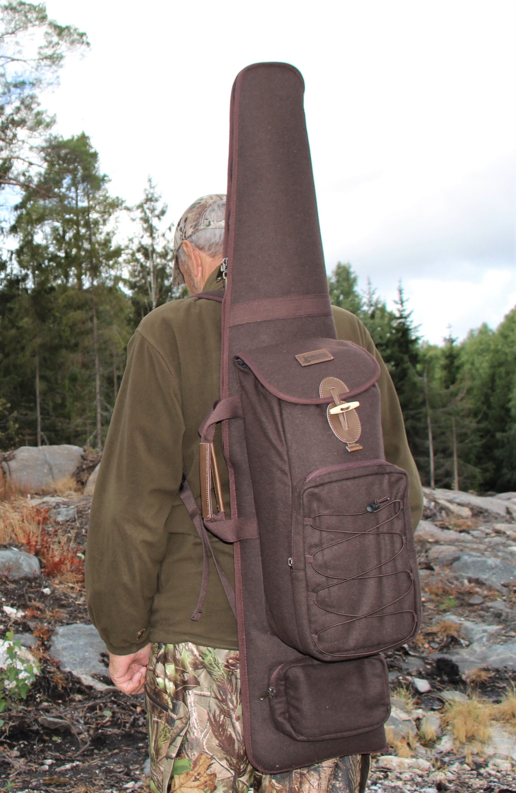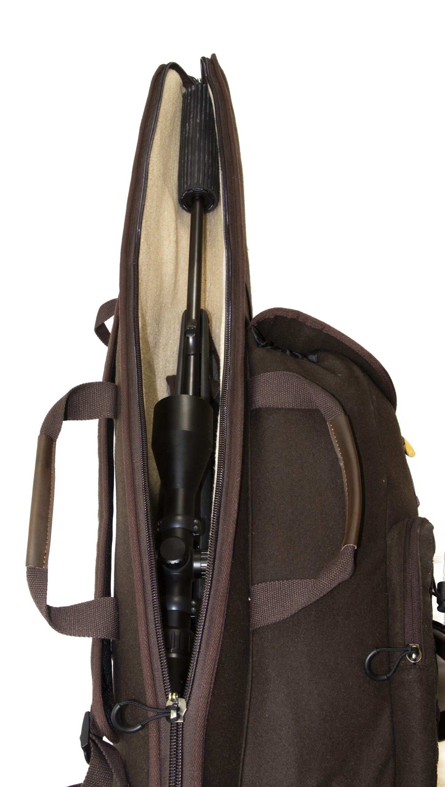 Luksus Våbenfoderal med rygsæk og bæreremme. Let, lydløst og lækkert design. En kombination af riffeletui og rygsæk. Ekstra længde for riffel med lyddæmper. Stort hovedrum med lynlås, frontlomme med lynlås og elastik remme. Separat lomme for bundstykke og ammunition eller lignende. Riffeletuiet er foret med lækkert imiteret lammefor. Bærehåndtag og rygsækremme