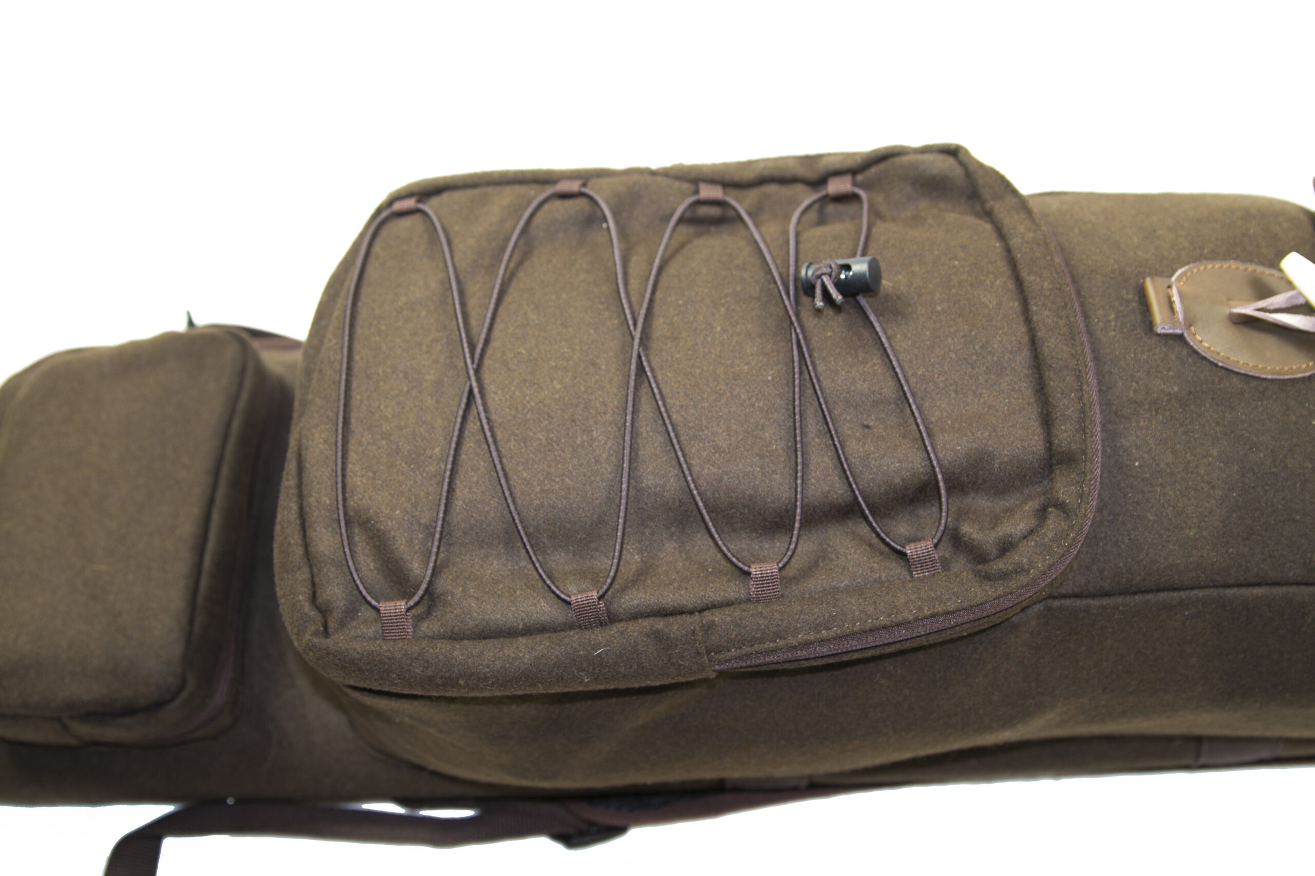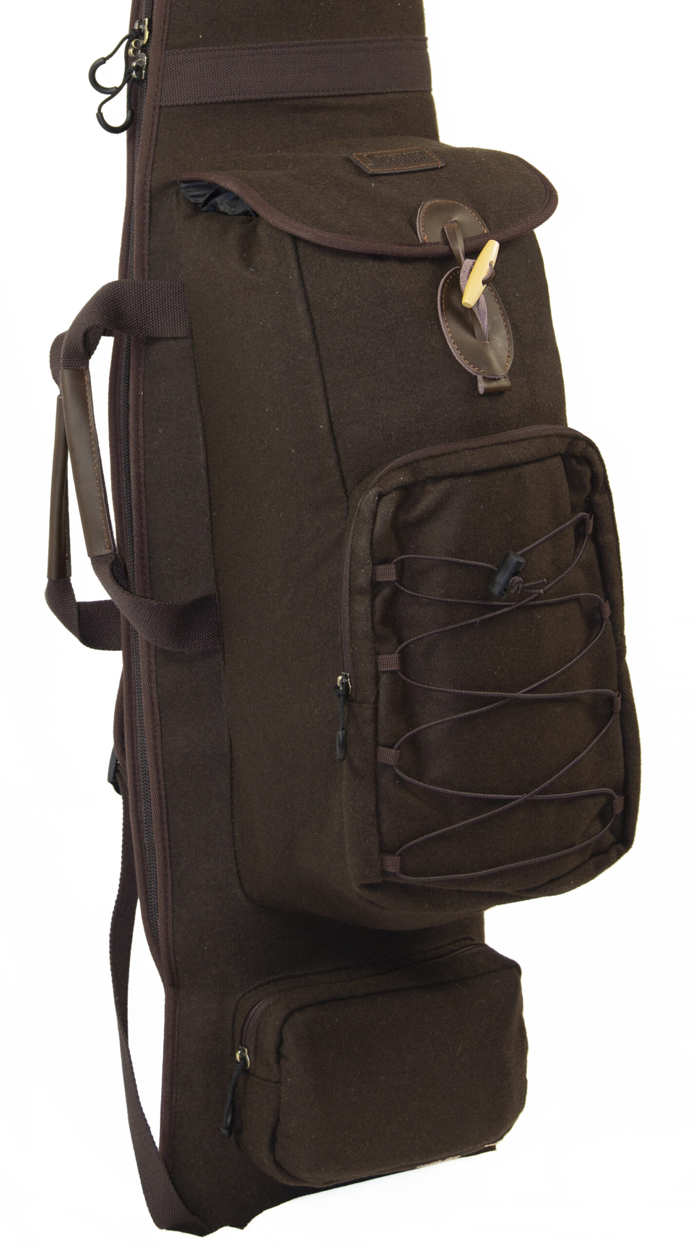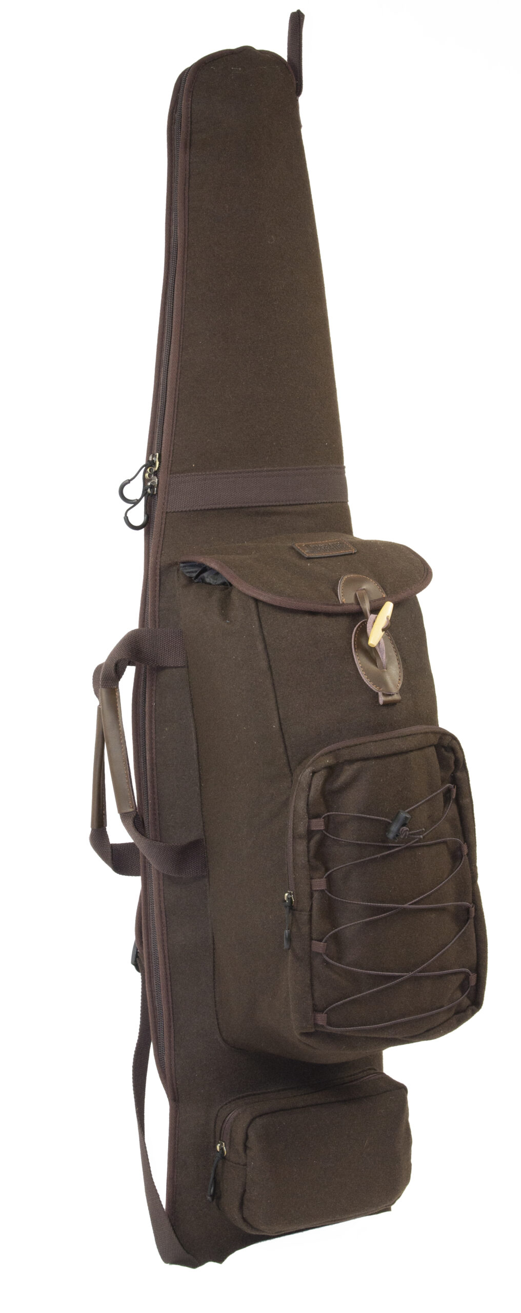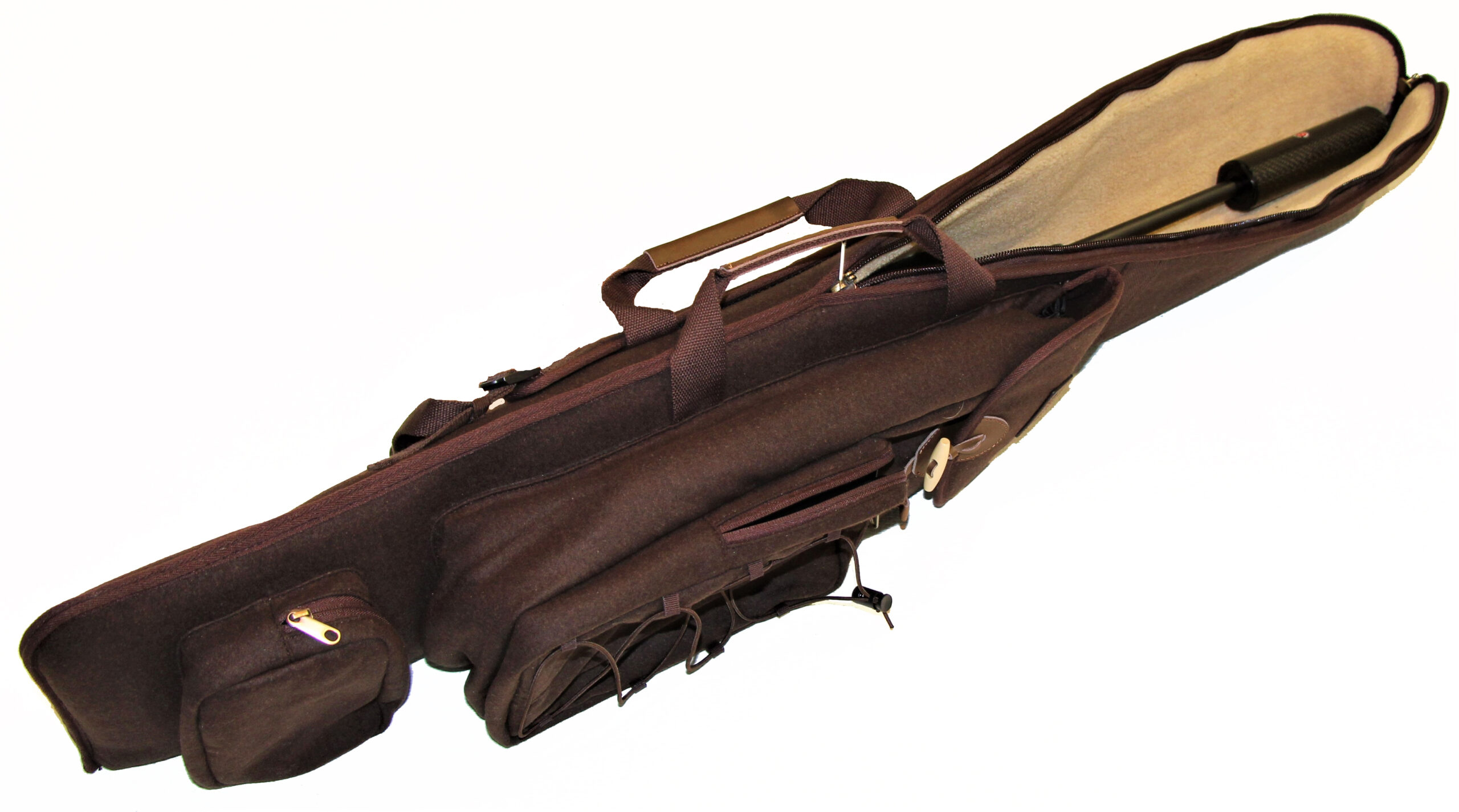 Luksus Våbenfoderal med rygsæk og bæreremme. Let, lydløst og lækkert design. En kombination af riffeletui og rygsæk. Ekstra længde for riffel med lyddæmper. Stort hovedrum med lynlås, frontlomme med lynlås og elastik remme. Separat lomme for bundstykke og ammunition eller lignende. Riffeletuiet er foret med lækkert imiteret lammefor. Bærehåndtag og rygsækremme